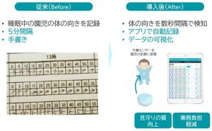 午睡チェックは、園児の胸にセンサーを付けて、体の向きを自動で判別。その情報をiPadアプリが記録していくことで、今まで手書きしていた作業が自動化されました。加えて、園児がうつぶせ寝になったときはアラートを発出。目視とICTによる二重チェック体制によって見守りの質が高まると共に、手書きの作業がなくなることで業務負荷の軽減にもつながりました。
