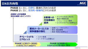 その背景には、AGCに昔から根付いている「改善することが仕事」という文化があります。DXも、単にデジタル技術の導入を目的とするのではなく、業務改善や新たな価値の創出によるコーポレートトランスフォーメーションを実現するための手段と位置づけられています。上述の文化の中で日々当たり前のように取り組まれていることが、成果につながっているのです。