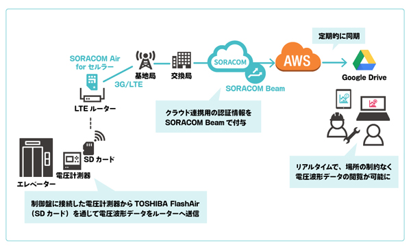 手始めに、エレベータの温湿度モニタリングに取り組みました。温度・湿度センサーからのデータを、SORACOM Airに対応した通信ゲートウェイを通じて、AWS上に構築したシステムにデータを送信して可視化するシンプルな構成のシステムです。ネットワークの敷設やサーバー準備の時間を必要としないため、約2週間でプロトタイプが完成しました。