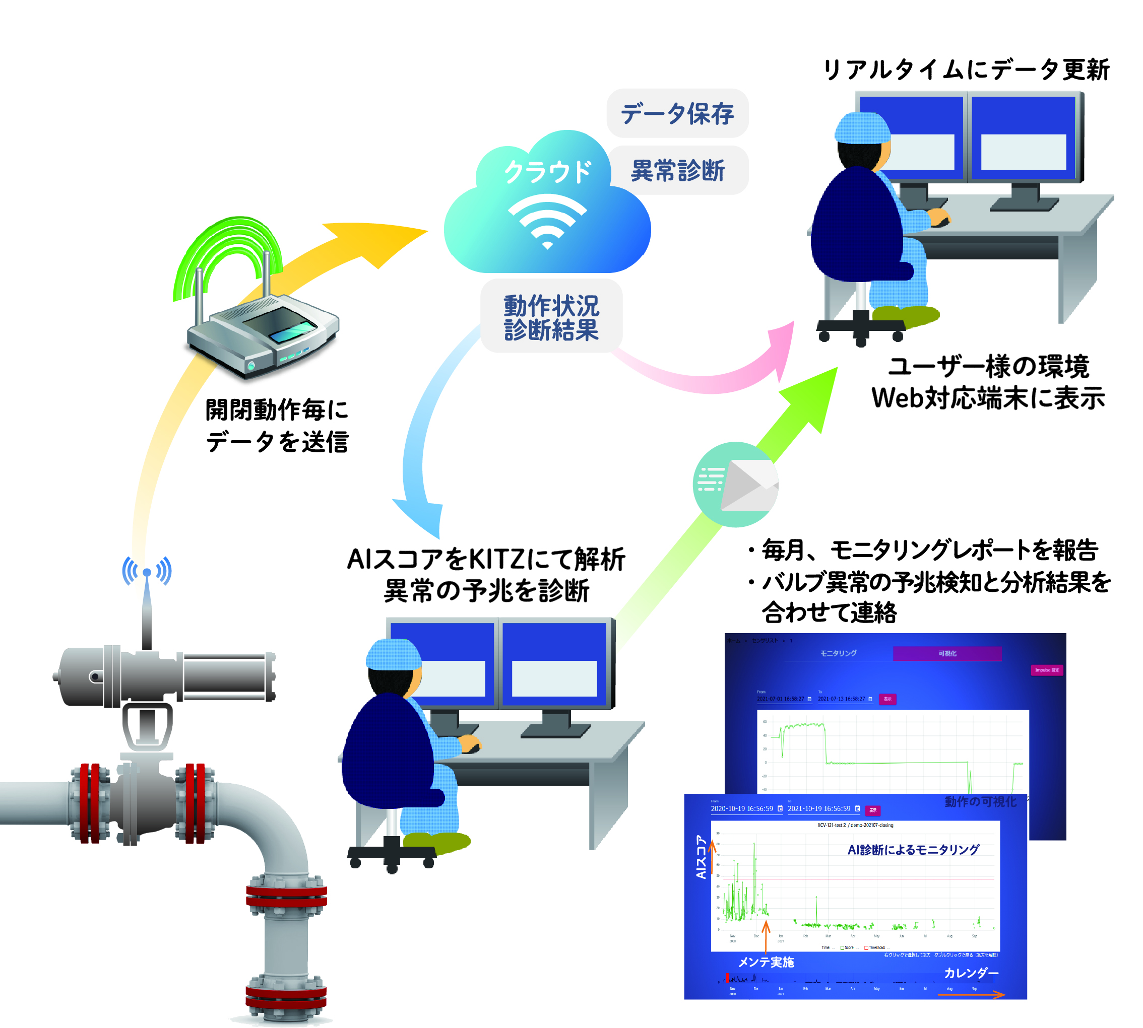 - 設備に簡単に後付けできるセンサーでバルブの動作データを取得し、AIでスコア化した上で診断レポートを発行するサービスを提供