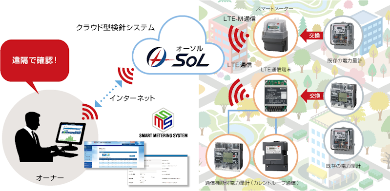 メーターで収集されたデータは、CO2・エネルギー管理プラットフォーム「O-SoL(オーソル)」に連携され、オーナーが利用できる検針や日報などの管理ツールを提供しています。このクラウド上のシステムとの連携にSORACOMのサービスを利用し、デバイス側での開発工数も削減し、短期間での製品化を実現しています。この仕組みは、安全性やメンテナンス性にも配慮した設計になっています。