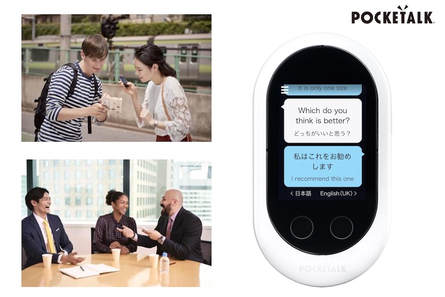 同年11月には、POCKETALK®(ポケトーク)、2018年9月には大幅に進化した新モデル POCKETALK W を発売しました。POCKETALK は、互いに相手の言葉を話せなくても、まるで通訳がいるように対話できる通訳機です。74言語の通訳に対応。対話のために設計された専用機ならではの、使いやすさが特長です。特別な設定不要で、箱を開けたらすぐに使えます。2019年4月には「音声翻訳機」カテゴリでシェア96.0%となり(2019年4月 BCN シェア)、海外旅行者はもちろん、インバウンドの観光客をお迎えする駅や店舗、美容院に至るまで、さまざまな業種の企業に導入されています。