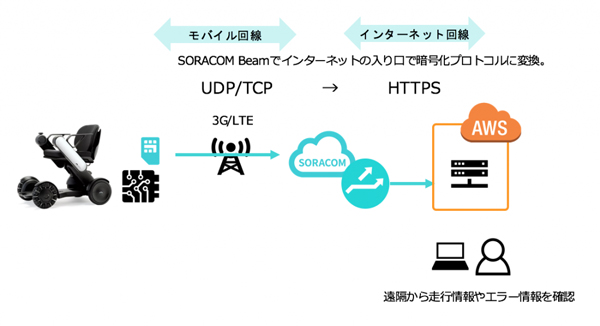 WHILL のモビリティとしての機能を最大限に活かすためには、通信にかかるデバイスの負荷を小さくする必要があります。SORACOM Beam では、UDP もしくは TCP → HTTPS へのプロトコル変換と、ルーティング変更を利用しています。SORACOM は、通信キャリアから専用線でクラウドまでセキュアにデータを送信します。クラウド側で HTTPS に変換し、サーバに送信することで、少ない通信量でセキュアにデータ送信゙可能です。この機能により、開発にかかる時間を大幅に短縮し、バッテリー消費量を抑えることができました。またルーティング変更機能により、簡単にに接続先をクラウド上で切り替えることができます。