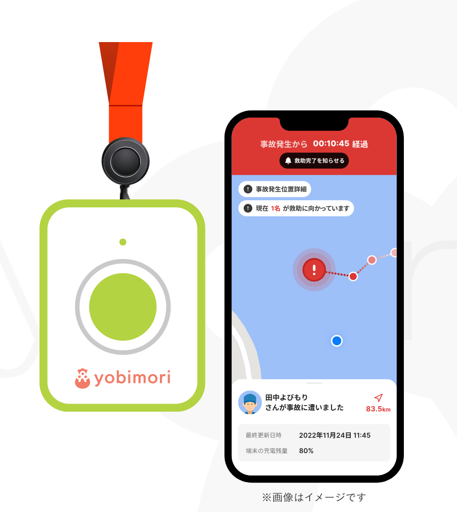 「よびもり」の仕組みは非常にシンプルです。必要なのは、首から下げられる小さなSOS発信端末とスマートフォンのアプリのみ。SOS発信端末は、セルラー通信を使って一定時間ごとに位置情報を取得しており、1回の充電で数日稼働することができます。