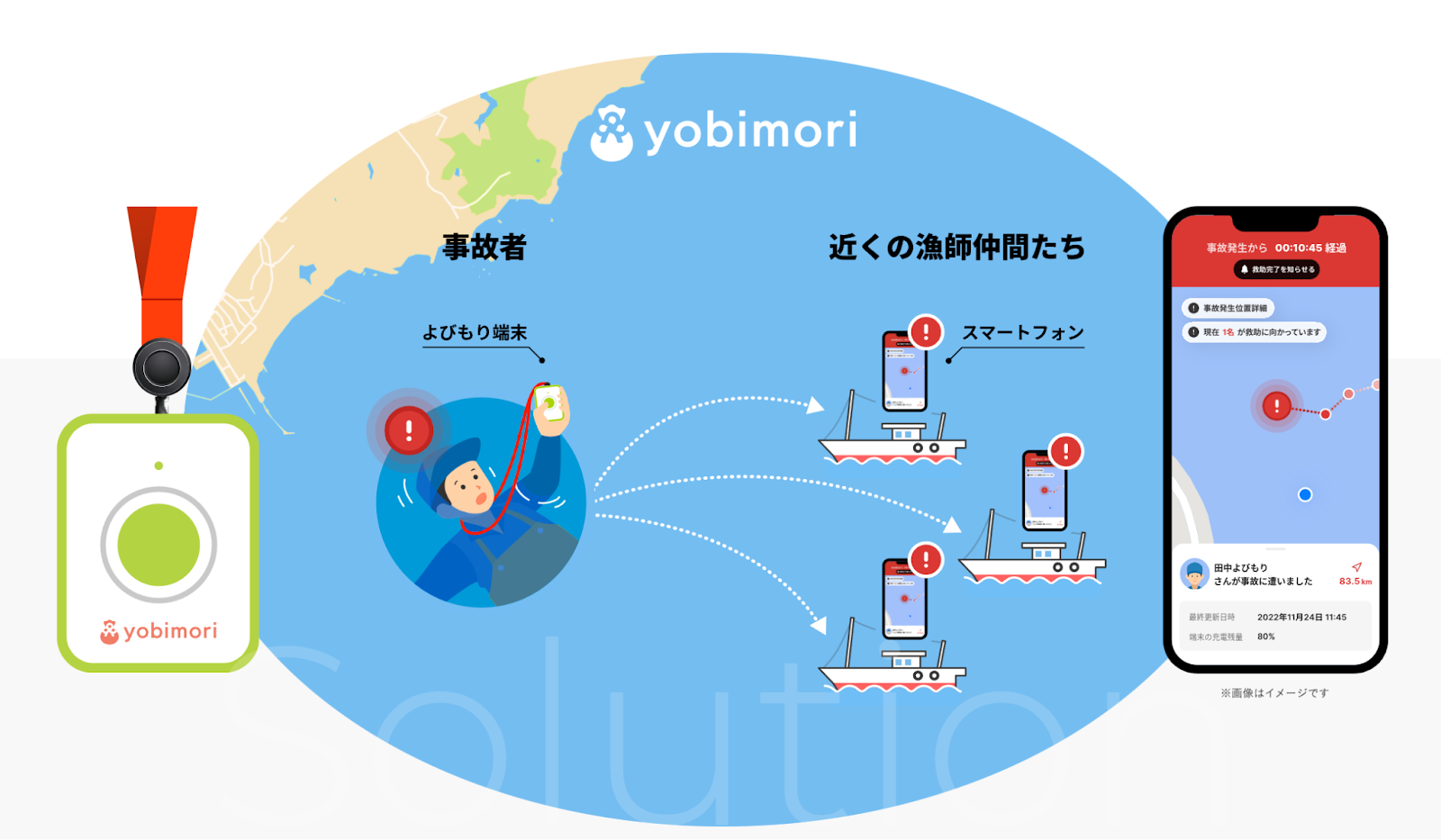 漁師など海に出ている人が海難事故に巻き込まれた場合、端末のボタンを押せば、アプリに事故発生と経過時間、現場の位置情報が通知され、周囲の船が一次救助に向かえるという仕組みです。アプリへの通知は複数名に行うことができ、上限数に制限はないため、組織単位で導入することもできます。